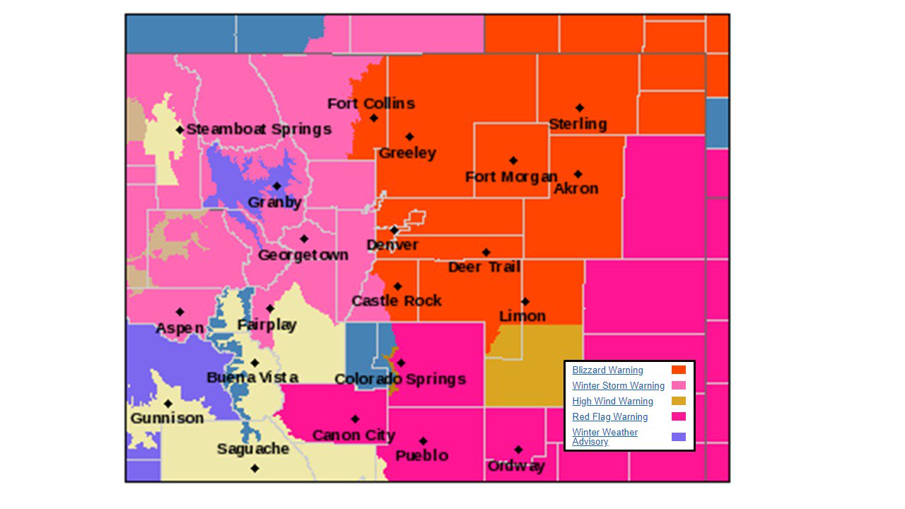 The blizzard warnings are in effect from noon Wednesday until noon Thursday for most of northeastern Colorado including Denver Fort Collins Greeley Castle Rock and. Residents under blizzard warnings are advised to travel only in an emergency. As winter weather bears down on Colorado a blizzard warning is active for parts of the state.
